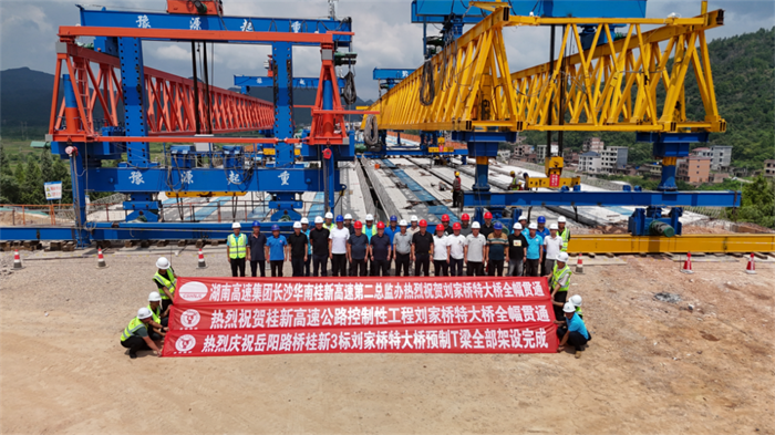 7月30日上午,随着右幅最后一片T梁精准就位,岳阳路桥集团承建的湖南省桂东至新田(宁远)高速桂阳至新田段控制性工程——刘家桥特大桥顺利全幅架通,为桂新高速公路全线早日贯通奠定了坚实基础。